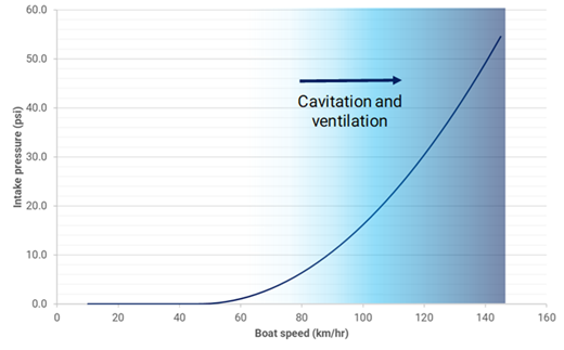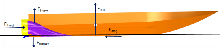 A free-body diagram of the jet boat is shown in Figure 2, together with an X–Y plot of intake pressure versus boat speed in Figure 3. As vessel speed increases, the mass flow entering the intake rises rapidly. Beyond a certain operating point, the jet pump is no longer able to process all the incoming water. This mismatch leads to a rapid increase in intake pressure, producing an additional vertical force acting on the aft section of the hull.